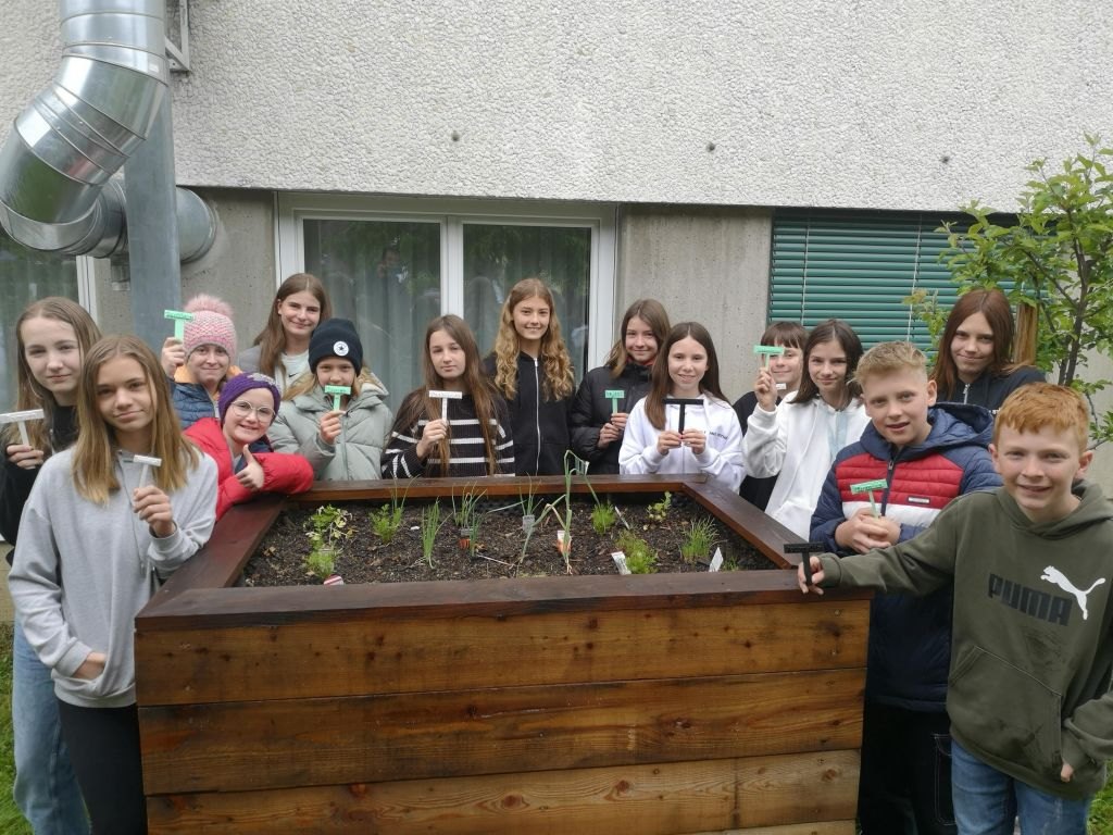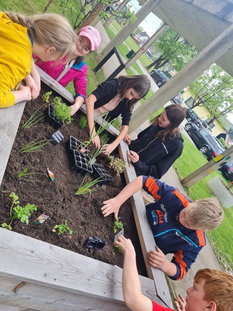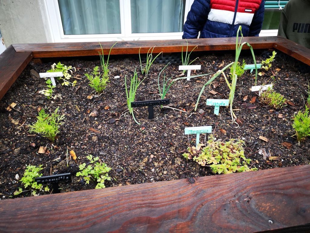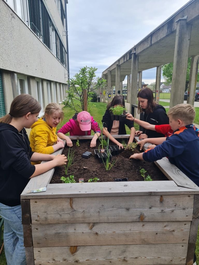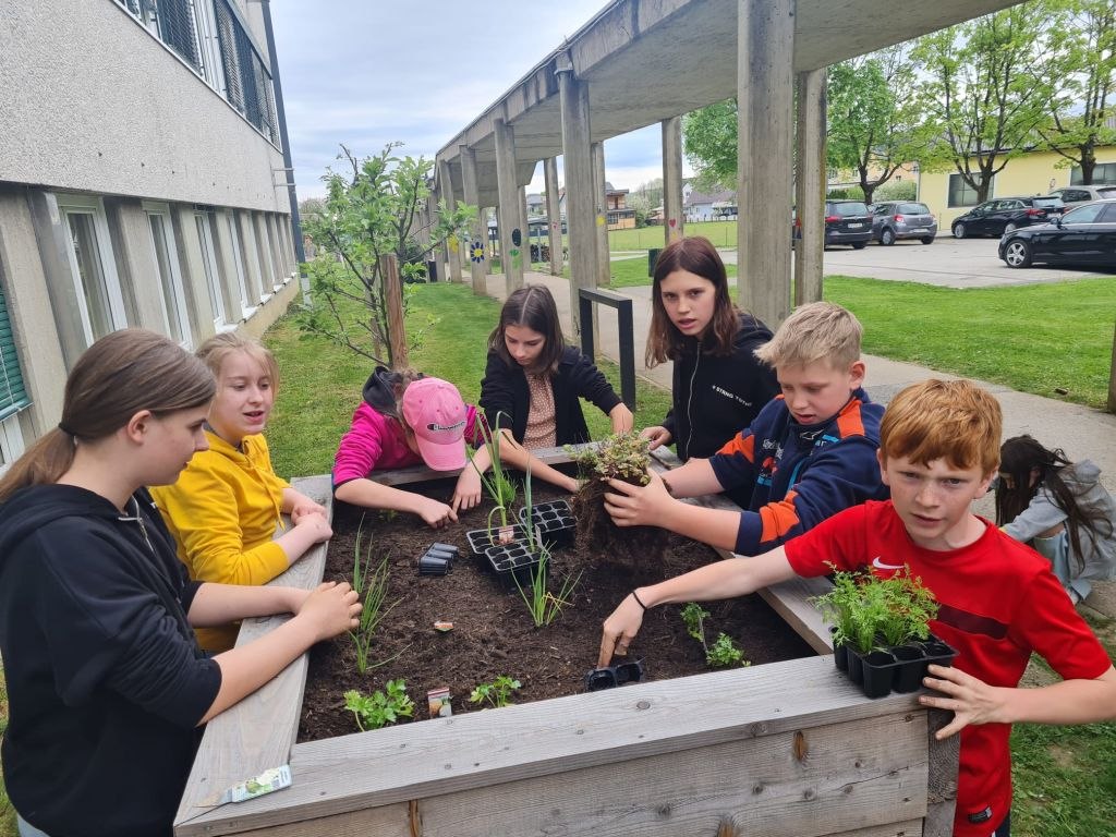 Die 2b Klasse gestaltete im Mint-Unterricht das Hochbeet der Schule neu. Die Schülerinnen und Schüler lernten die Vorteile des Hochbeetes kennen, setzten frische Pflanzen ein und gestalteten die Pflanzenschilder mit Tinkercad am Computer. Die selbst gestalteten Schilder wurden mit dem schuleigenen 3D Drucker ausgedruckt und kennzeichnen nun die Pflanzen. Das Ziel des Projekts ist es die Kräuter auch im EH Unterricht verwenden zu können. Wir hoffen auf eine gute Ernte!