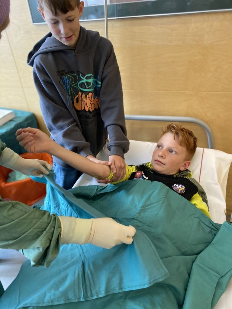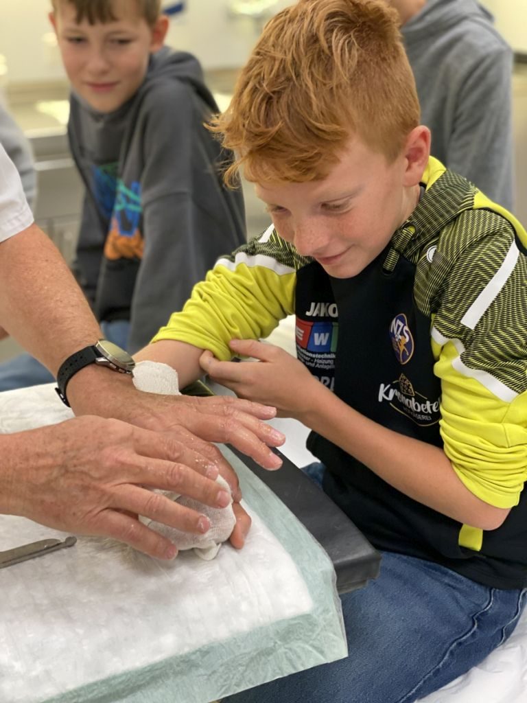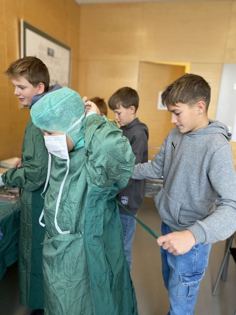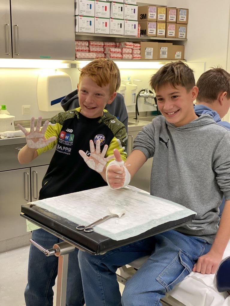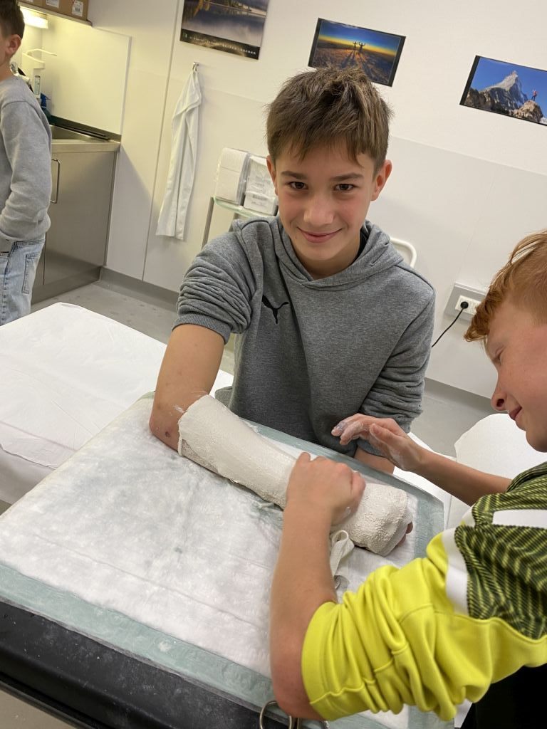 Ein Highlight des Tages war das Anlegen von Gipsverbänden, bei dem die Schüler selbst Hand anlegen durften. Mit großer Begeisterung übten sie diese Tätigkeit, die ihnen den Alltag von medizinischen Fachkräften näherbrachte. Zusätzlich erhielten sie die Chance, in die Rolle eines OP-Assistenten zu schlüpfen. Dabei konnten sie nicht nur die spezielle Kleidung ausprobieren, sondern auch erfahren, welche Aufgaben und Herausforderungen diese Position mit sich bringt.