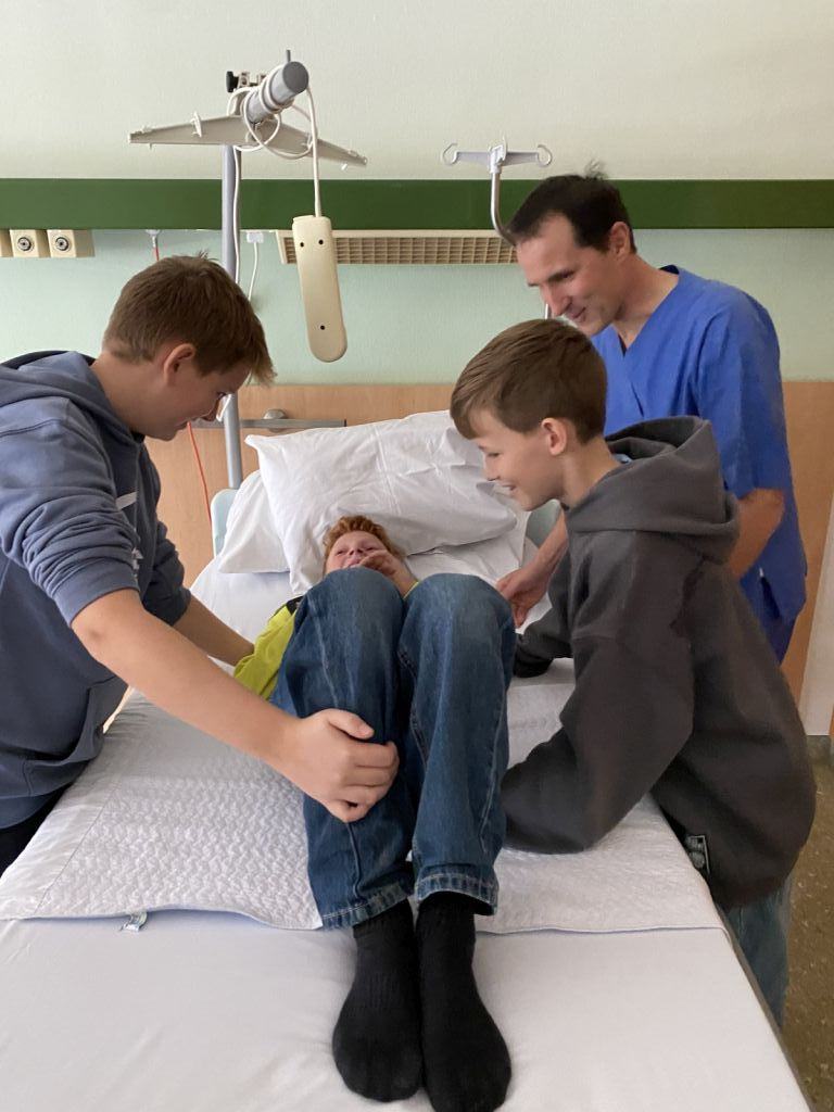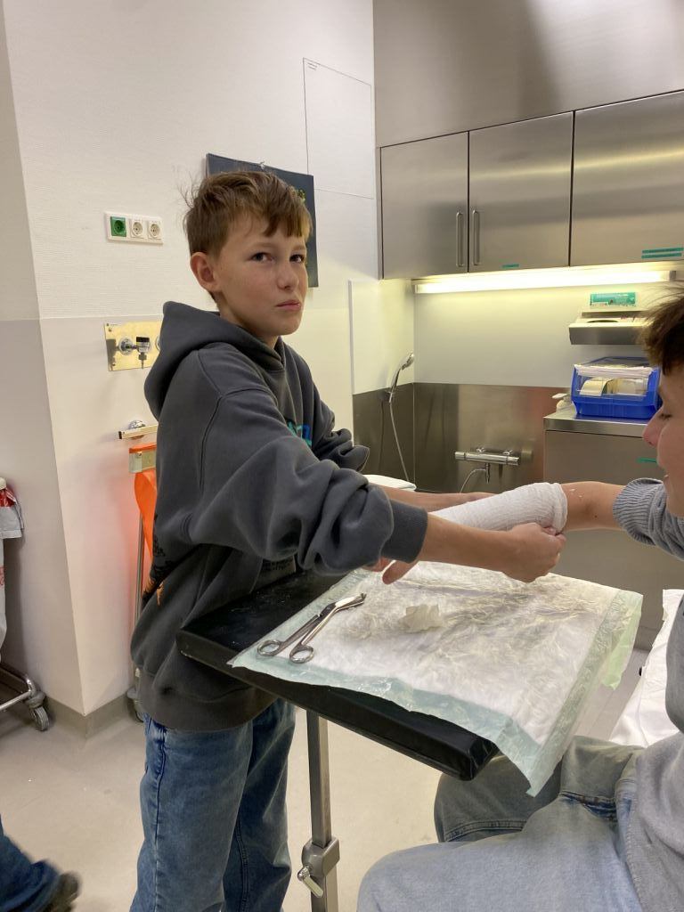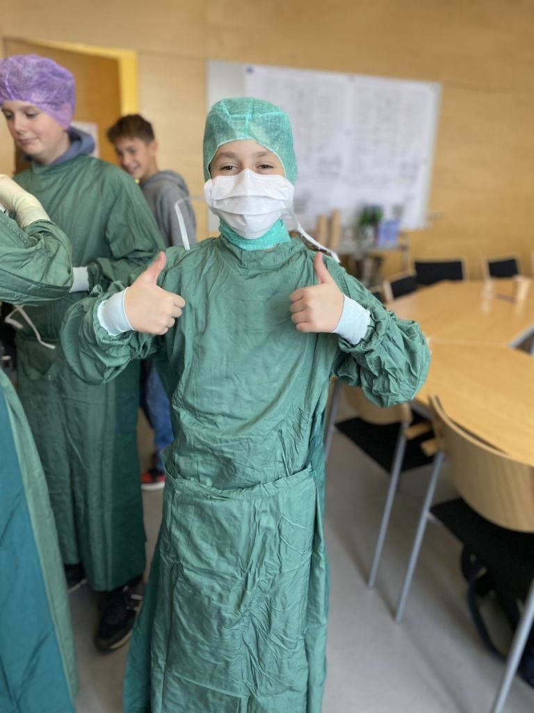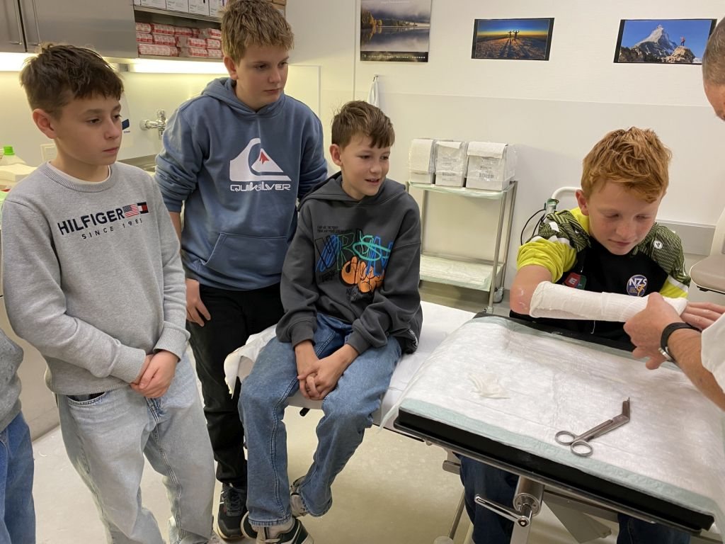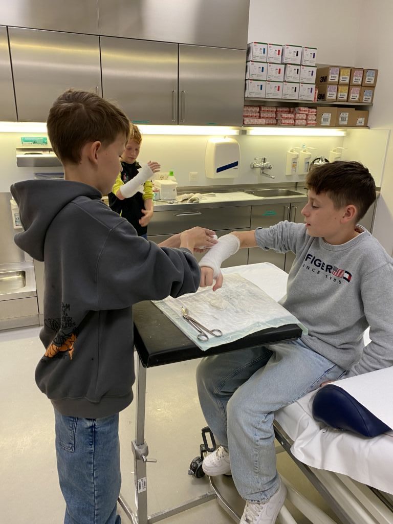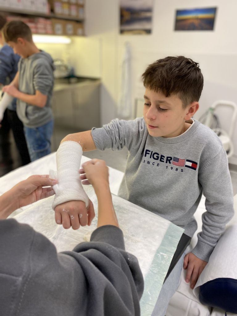 Ein Highlight des Tages war das Anlegen von Gipsverbänden, bei dem die Schüler selbst Hand anlegen durften. Mit großer Begeisterung übten sie diese Tätigkeit, die ihnen den Alltag von medizinischen Fachkräften näherbrachte. Zusätzlich erhielten sie die Chance, in die Rolle eines OP-Assistenten zu schlüpfen. Dabei konnten sie nicht nur die spezielle Kleidung ausprobieren, sondern auch erfahren, welche Aufgaben und Herausforderungen diese Position mit sich bringt.