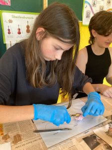Was zunächst nach einem kleinen Gruselfilm klang, entpuppte sich schnell als echte Entdeckungsreise. Mit Einweghandschuhen, Skalpell und jeder Menge Neugier untersuchte die Klasse, wie ein echtes Auge aufgebaut ist. Schnitt für Schnitt erkundeten sie Hornhaut, Iris, Linse und den glasklaren Glaskörper. Alle waren erstaunt darüber, wie ähnlich das Rinderauge dem menschlichen Auge ist.