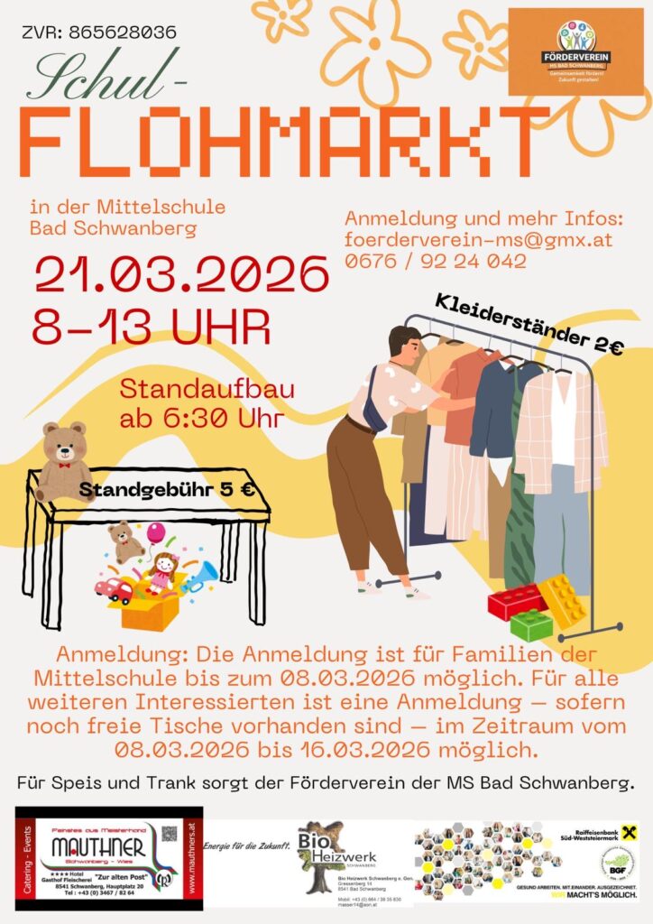 Am Samstag, 21. März 2026, verwandelt sich die Mittelschule Bad Schwanberg von 8:00 bis 13:00 Uhr in ein Paradies für Schnäppchenjäger. Der Förderverein der MS Bad Schwanberg lädt herzlich zum großen Schul-Flohmarkt ein. Ob Kleidung, Spielsachen, Bücher oder allerlei Raritäten – hier ist für jeden etwas dabei!